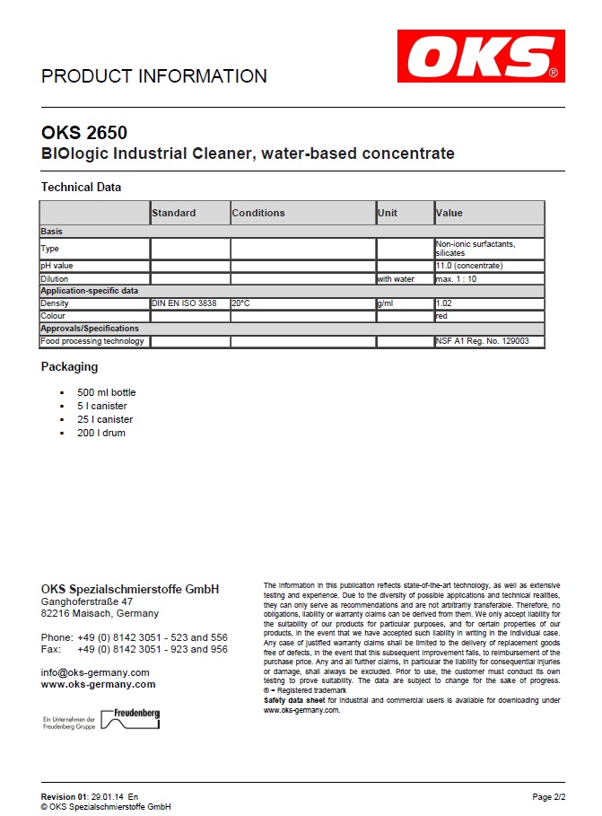 OKS清洗剂2650生物工业清洗剂,水基浓缩液。用于清除带有厚重油烟的污垢的水质清洁剂。可生物降解;具有良好的清除性能;温和,不损伤细腻表面;通用于工业、修理厂和食品技术设备